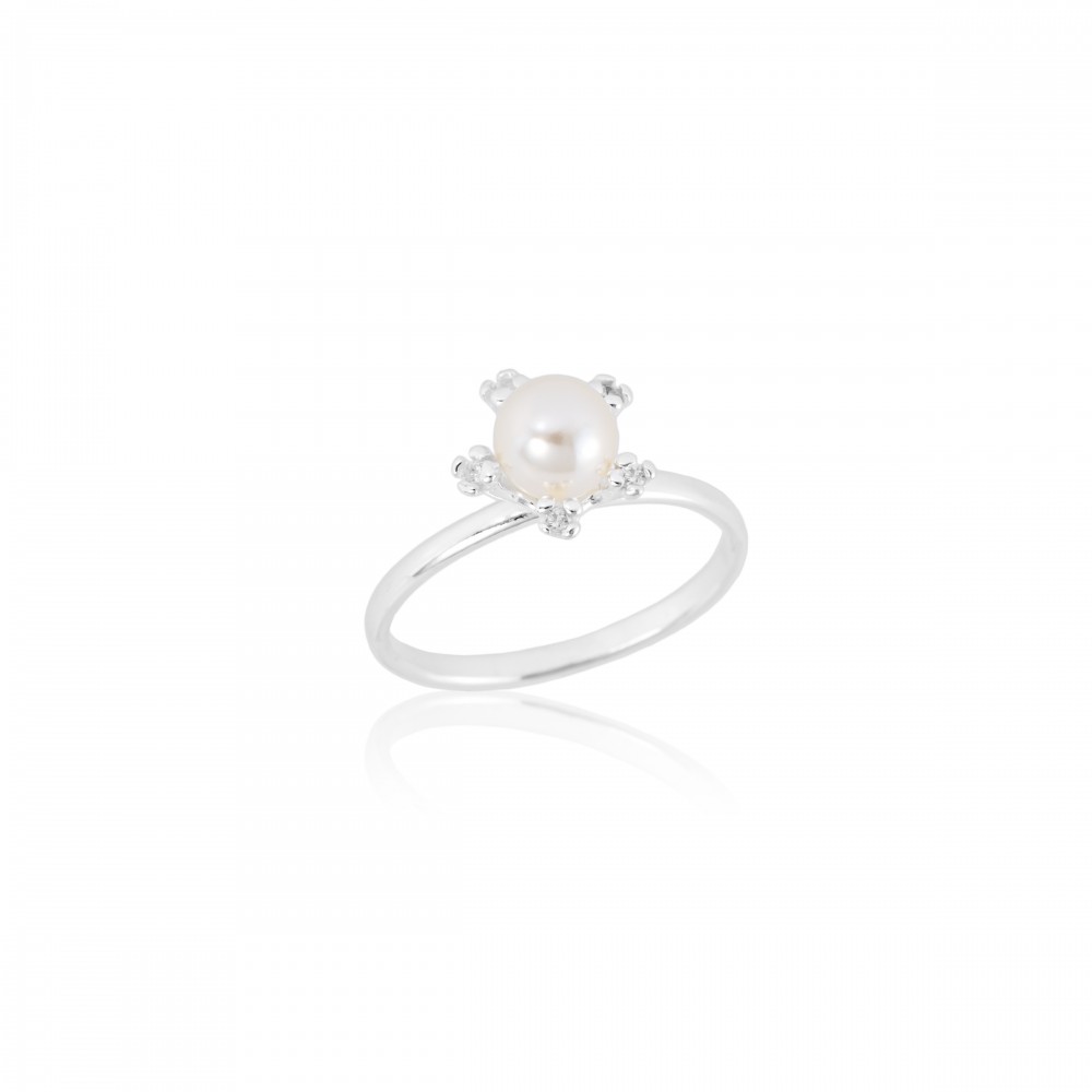 O Anel em Prata 925 com Pérola Sintética e Zircônias é o equilíbrio perfeito entre o clássico e o moderno. A pérola central de 6 mm é envolvida por pequenas zircônias de 1 mm, criando um brilho sutil e refinado.