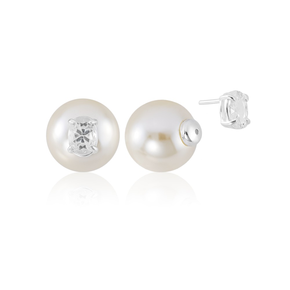 Brinco Pérola com Pedra Oval Zircônia Cristal Prata 925 Duo Sculpta