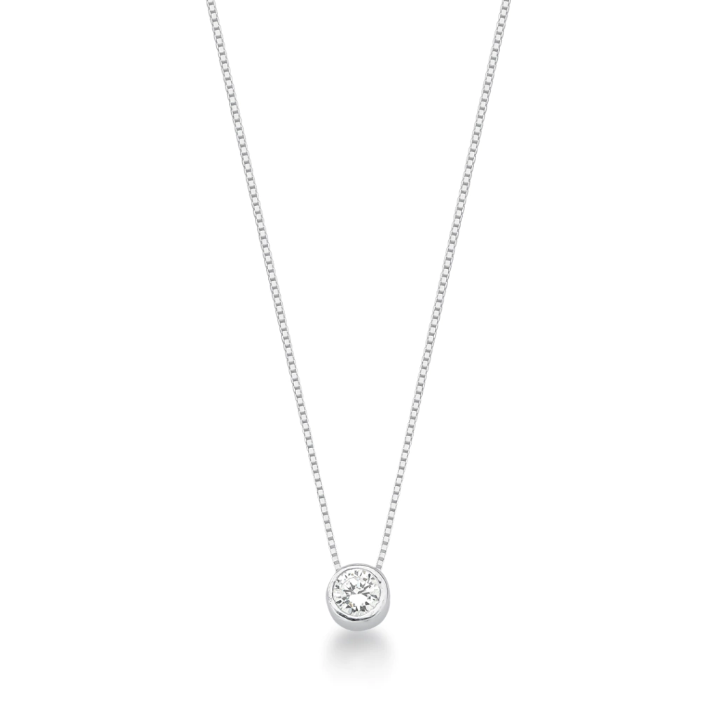 O pingente ponto de luz é composto por uma pedra cristal central, envolvida por uma borda lisa em prata, criando um visual clássico e atemporal que combina com qualquer ocasião.