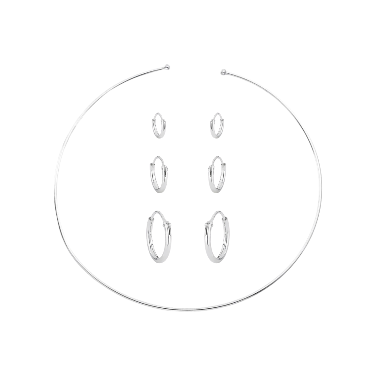 Kit completo em Prata 925 legítima composto por Trio de Argolas Rebitadas (P, M e G) + Choker Lisa Regulável Minimalista.