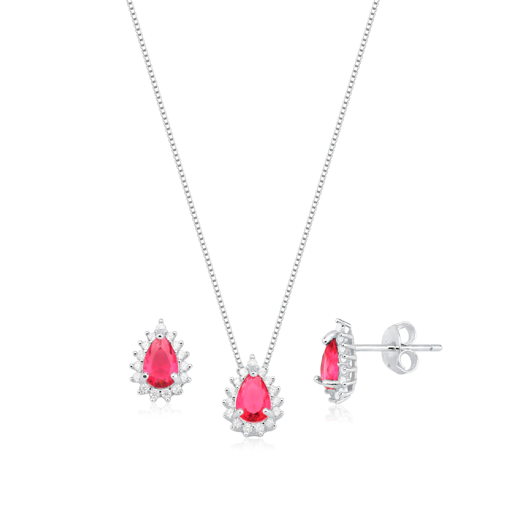O Conjunto Ponto de Luz Gota Turmalina Rosa Cravejado em Prata 925 traz um pingente e um par de brincos delicados, com pedra rosa em formato de gota presa em prata cravejada — romântico, moderno e super elegante.