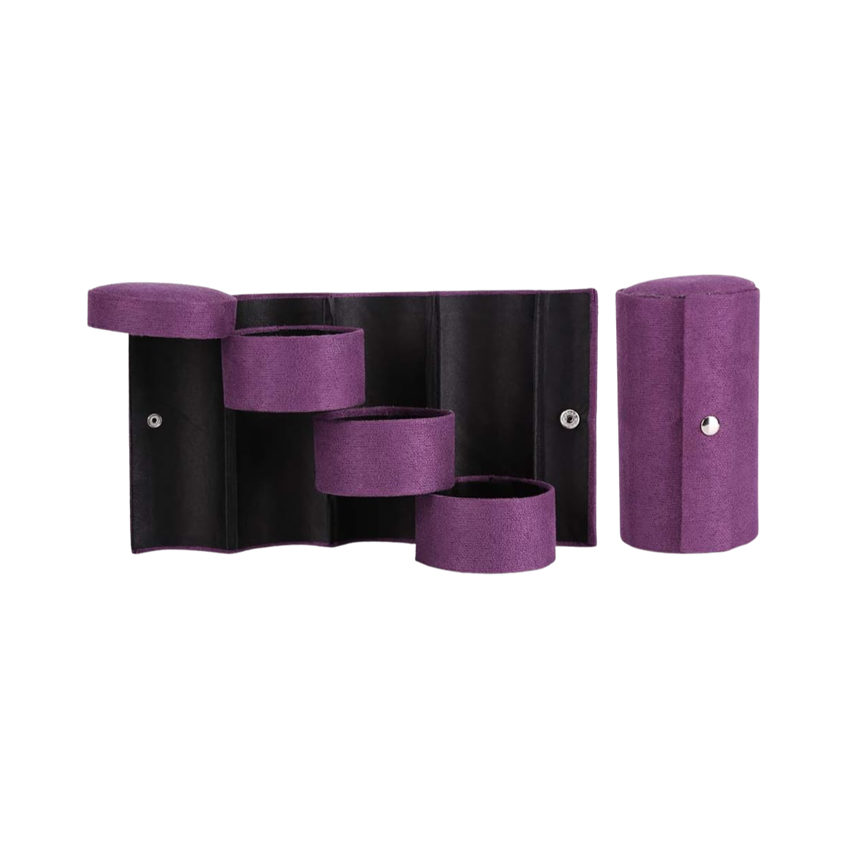 Porta-joias compacto em formato de mini cilindro, ideal para uso doméstico e em viagens. Revestido externamente com flanela e internamente aveludado, protege suas joias com elegância. Conta com botão de pressão para fechamento seguro, rotação de 360° e design em escada que facilita o acesso às peças. Possui 3 divisórias dobráveis para armazenar anéis, brincos, colares e pulseiras de forma prática e organizada.