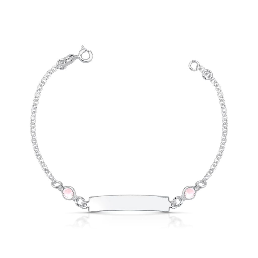 Confeccionada em Prata 925 legítima, combina a plaquinha lisa com dois cristais rosa que trazem um charme extra e um brilho suave, ideal para crianças.