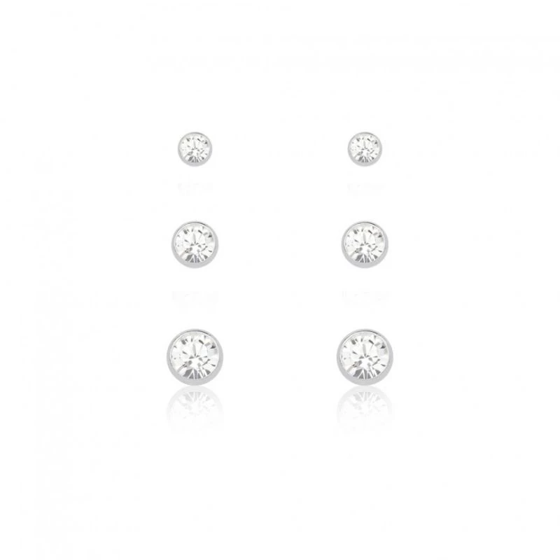 O Kit de Brincos Ponto de Luz é composto por 3 pares de brincos redondos com pedra transparente brilhante, perfeitos para quem tem 3 furos ou ama composições equilibradas.